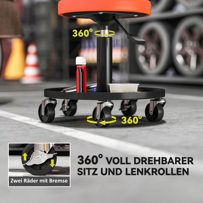 Werkstatthocker mit Rollen Ablagefläche höhenverstellbar 38-50cm bis 135 kg belastbar Orange