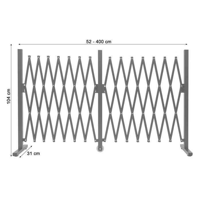 - Diese praktische Absperrung lässt sich mit dem stufenlos ausziehbaren Gitterelementen beliebig ausziehen und kann somit problemlos eine Gesamtbreite von 400 cm erreichen.
