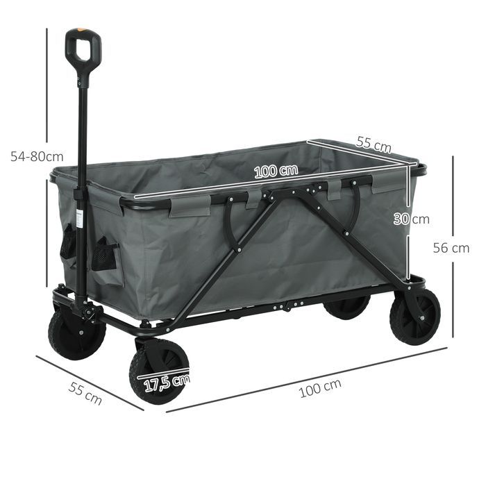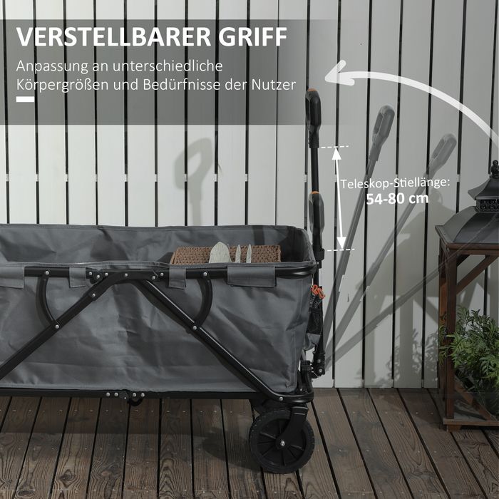 Entdecken Sie die Natur mühelos mit dem Outsunny faltbare Bollerwagen! Mit einer grosszügigen 160L Kapazität und praktischen Taschen ausgestattet, aus robustem Oxford-Stoff gefertigt und mit geschmeidigen 360° schwenkbaren Vorderrädern versehen, ist der Strandwagen der perfekte Partner für Strandausflüge, Campingerlebnisse oder Gartenarbeit.