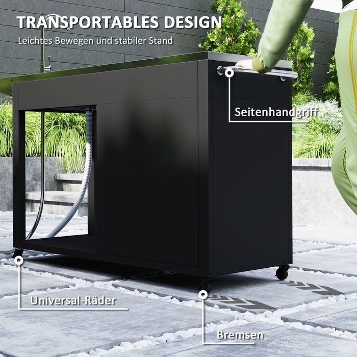 Grillwagen, Arbeitsfläche, Spüle, Räder, Edelstahl 162,5x47x87cm, Schwarz