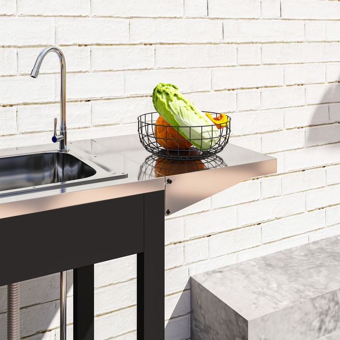 - Ein-Stop-Nahrungszubereitung: Ausgestattet mit einer Edelstahlarbeitsfläche zum Zerkleinern von Lebensmitteln, einem Spülbecken und einer ausklappbaren Seitenablage für zu waschende Lebensmittel ermöglicht dieser Grillwagen sämtliche Vorbereitungen an einem Ort.