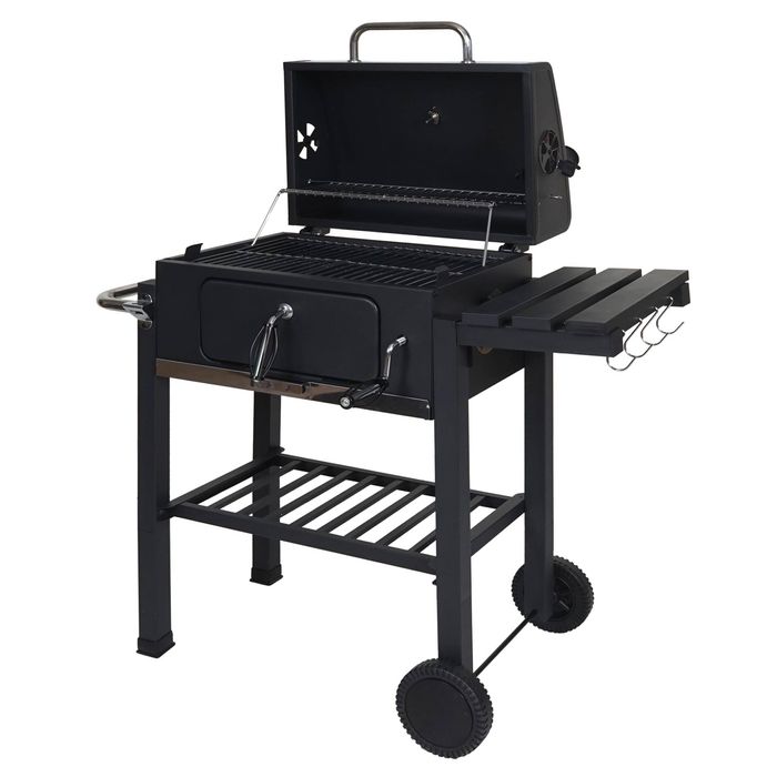 Der Standgrill ist aus robustem, pulverbeschichtetem Stahl gefertigt und in einem eleganten Schwarz gehalten. Der Kohlegrill ist mit einem Deckel ausgestattet, der über ein Belüftungsrohr und einen Temperaturmesser verfügt. So kann die Temperatur im Inneren des Grills jederzeit kontrolliert werden. Der Grillrost ist geteilt und abnehmbar und kann nach dem Grillen leicht gereinigt werden. Eine Kohleschale ist im Lieferumfang enthalten. Diese kann durch eine Kurbel in der Höhe reguliert werden in und bietet ausreichend Platz für Holzkohle. Eine Öffnungsklappe an der Vorderseite ermöglicht das Nachfüllen von Kohle während des Grillens. Der Grill verfügt über einen Warmhalterost, der das Grillgut warm hält, während andere Speisen noch auf dem Grill zubereitet werden. Die seitlichen Belüftungsschlitze des Grills können reguliert werden und sorgen so für eine optimale Luftzirkulation. Ein seitlich klappbarer Ablagetisch bietet Platz für Grillzubehör und ist mit Haken versehen, an denen Grillbesteck aufgehängt werden kann. Ein Handtuchhalter erleichtert das Arbeiten am Grill. Der Grillwagen verfügt zudem über ein grosses Ablagegitter unten, das ausreichend Platz für Grillutensilien bietet. Dank der Räder und der seitlichen Stange ist der Grillwagen leicht zu transportieren und kann bequem an den gewünschten Ort gestellt werden.