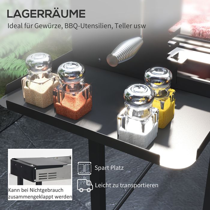 - Die seitlichen Ablageflächen können eingeklappt und der Grillrost bei Nichtgebrauch abgenommen werden