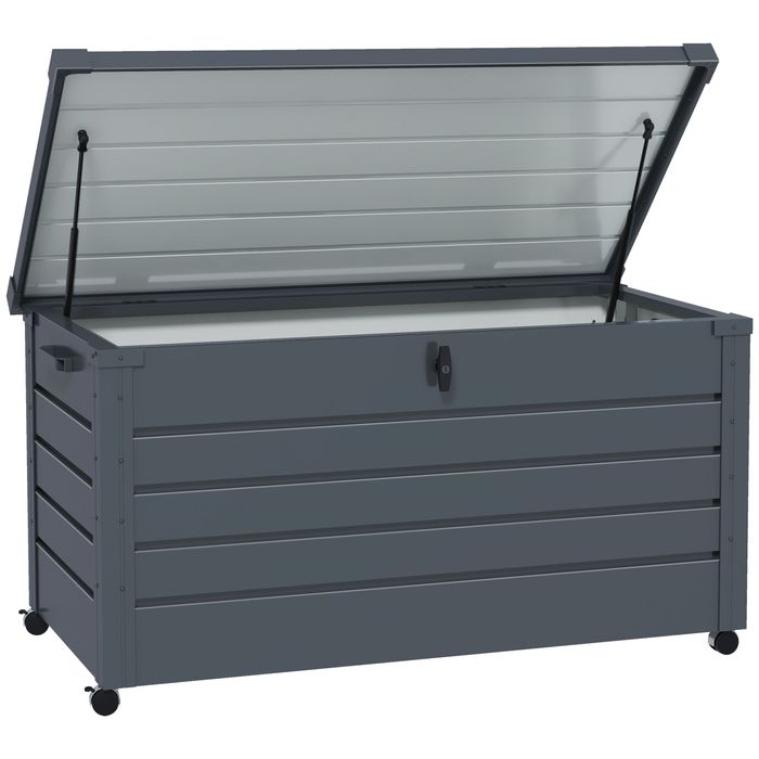 Die wasserdichte Auflagenbox ist eine robuste Aufbewahrungslösung und für den Aussenbereich konzipiert. Mit einem Fassungsvermögen von 311 Litern bietet die Auflagenbox viel Platz für Gartenzubehör, Werkzeuge und vieles mehr. Die aus verzinktem Stahl gefertigte Garten Aufbewahrungsbox ist robust und verfügt über einen leicht zu öffnenden Deckel, der das Verstauen erleichtert. Sie ist mit zwei Griffen und Rädern ausgestattet, sodass sie leer oder beladen leicht bewegt werden kann.