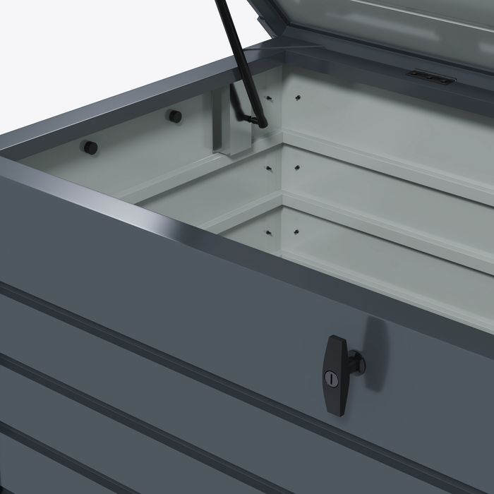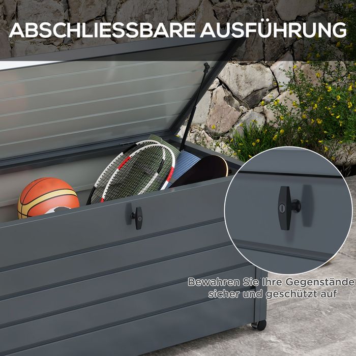 - Leicht zu öffnender und abschliessbarer Deckel: Ausgestattet mit einer Deckelhalterung, lässt sich der Deckel der Gartentruhe leicht öffnen und schliessen. Der abschliessbare Deckel schützt Ihre Gegenstände sicher