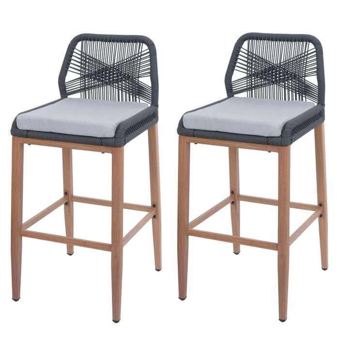2er-Set Rope-Barhocker HWC-O21, Outdoor Sitzpolster Seilgeflecht Metall Holz-Optik - anthrazit, Kissen hellgrau