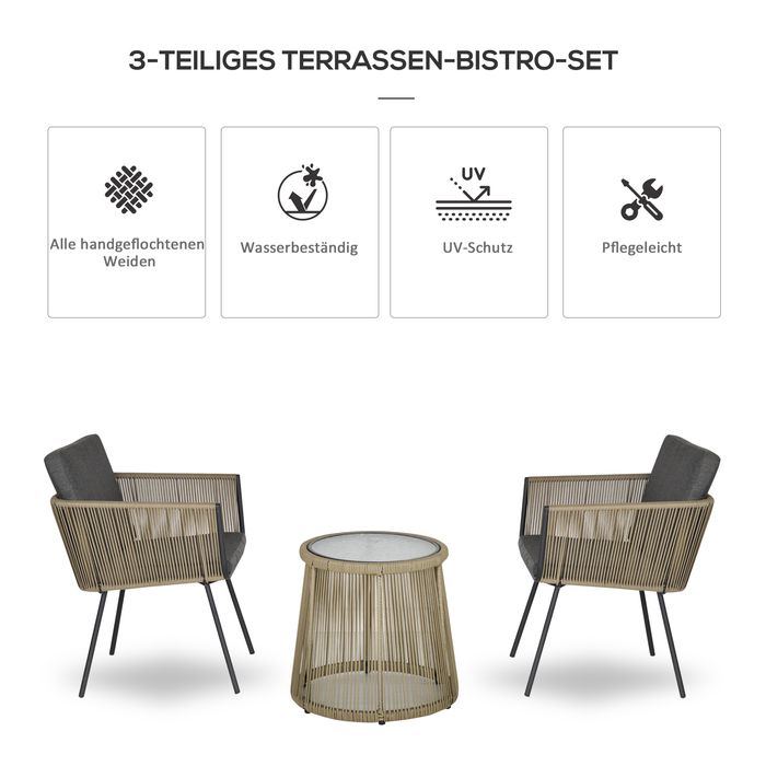 - 3-teiliges Bistro-Set: Enthält zwei Rattan-Stühle und einen Couchtisch mit einer Tischplatte aus Hartglas; ideal, um alleine eine Pause zu machen oder in Gesellschaft ein Getränk zu geniessen