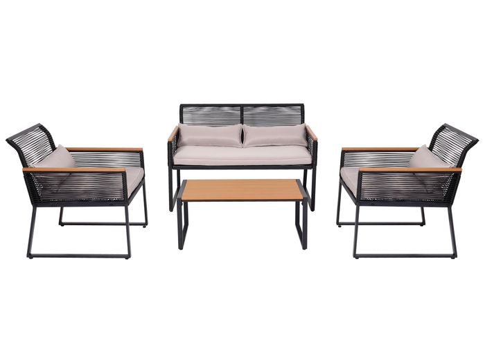 Die Gartenlounge besteht aus einem Sofa, zwei Sesseln und einem rechteckigen Tisch. Die Möbel bieten Platz für bis zu vier Personen, was ideal für gesellige Zusammenkünfte im Freien ist. Die Rückenlehnen des Sets bestehen aus einem elastischen Seilgeflecht, das für zusätzlichen Komfort sorgt und sich der Körperform anpasst.