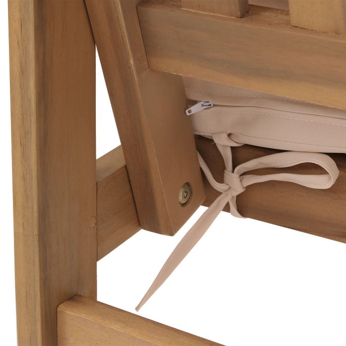 - Die Garten-Garnitur aus geöltem Akazienholz bietet mit Tisch, Bank und zwei Stühlen höchsten Komfort. Sitz- und Rückenkissen mit wasserabweisenden, abnehmbaren Bezügen sorgen für Bequemlichkeit, während Polster mit Bindebändern fixiert sind.
