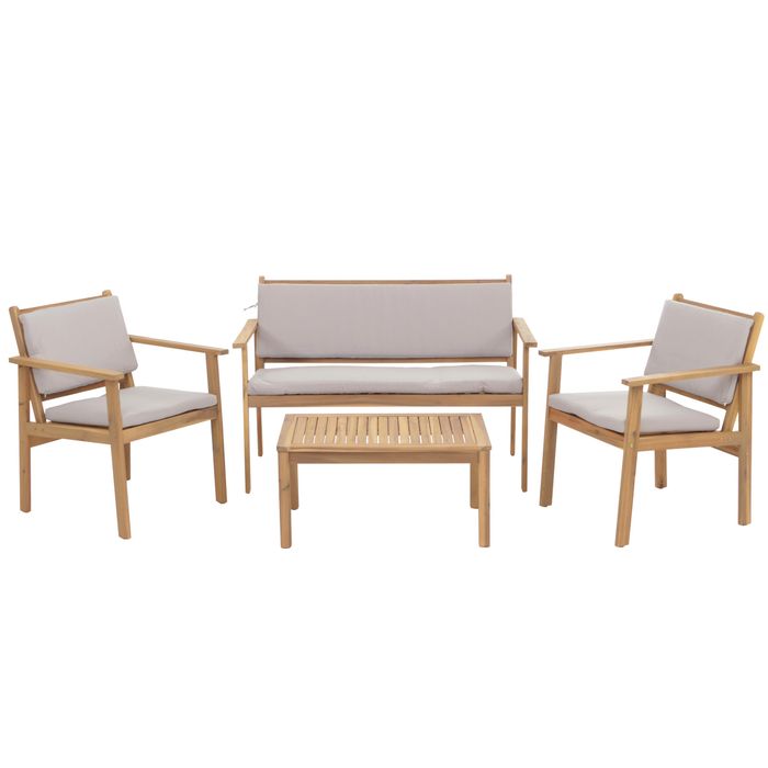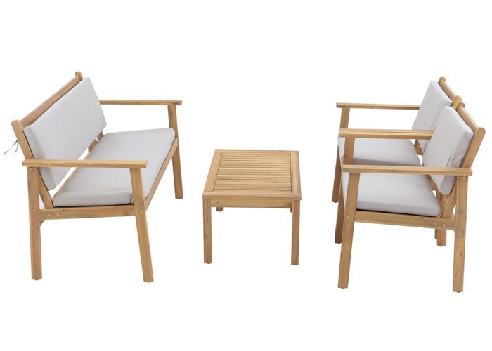 - Die Garten-Garnitur aus geöltem Akazienholz bietet mit Tisch, Bank und zwei Stühlen höchsten Komfort. Sitz- und Rückenkissen mit wasserabweisenden, abnehmbaren Bezügen sorgen für Bequemlichkeit, während Polster mit Bindebändern fixiert sind.
