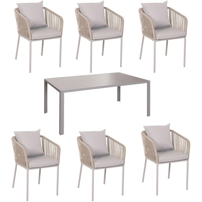 Gartengarnitur HWC-N41, Tisch+6xStuhl, wetterfest Alu 180x80cm, Seilgeflecht Rope – grau Kissen grau