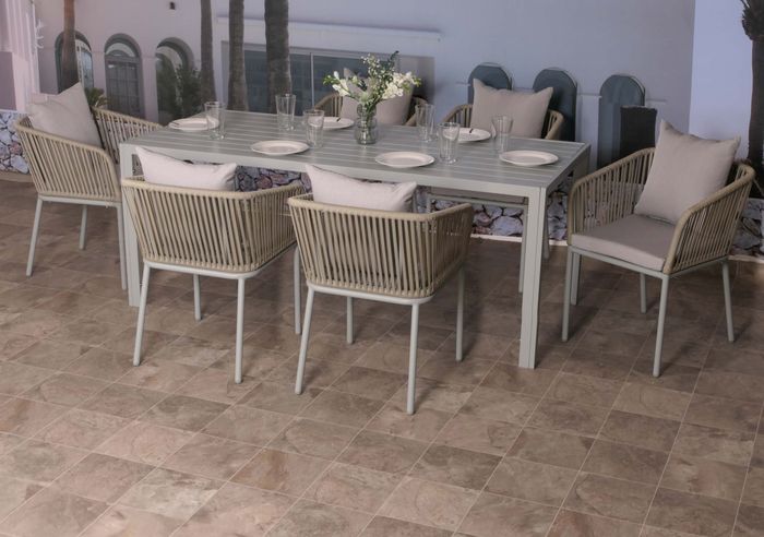 - Dieses Set, bestehend aus einem grosszügig dimensionierten Aluminium-Esstisch und sechs bequemen Stühlen, kombiniert zeitlose Eleganz mit modernem Design und Funktionalität, um Ihnen und Ihren Gästen ein ultimatives Outdoor-Erlebnis zu bieten.
