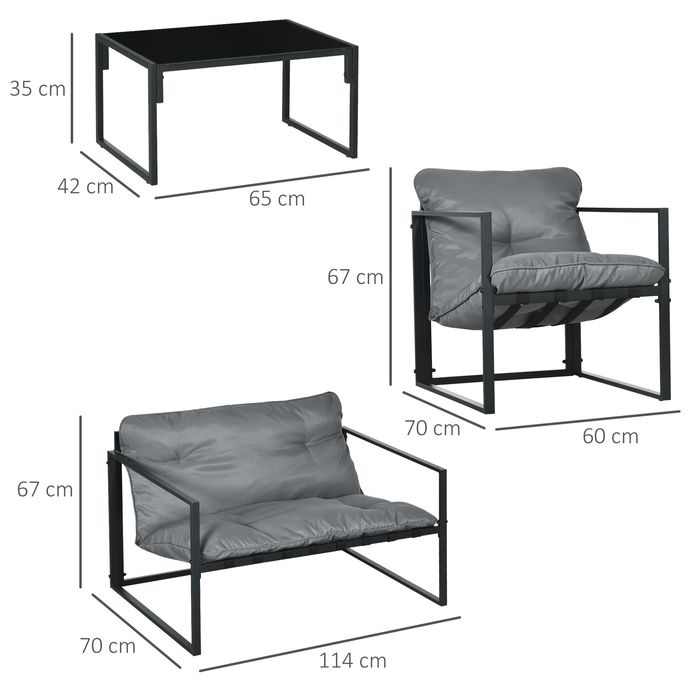 Gartenmöbel-Set, 1 Glastisch, 2 Sessel. 1 Sofa, wetterbeständig,114 cm x 70 cm x 67 cm, Grau+Schwarz