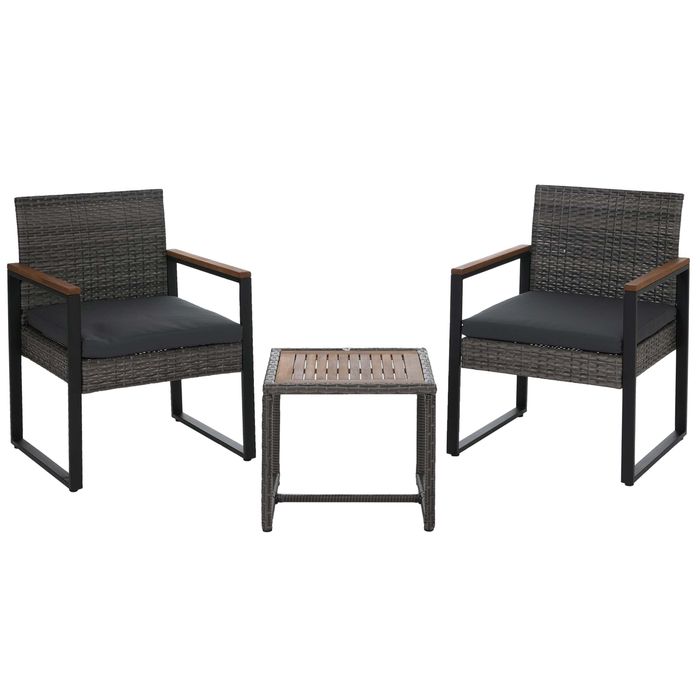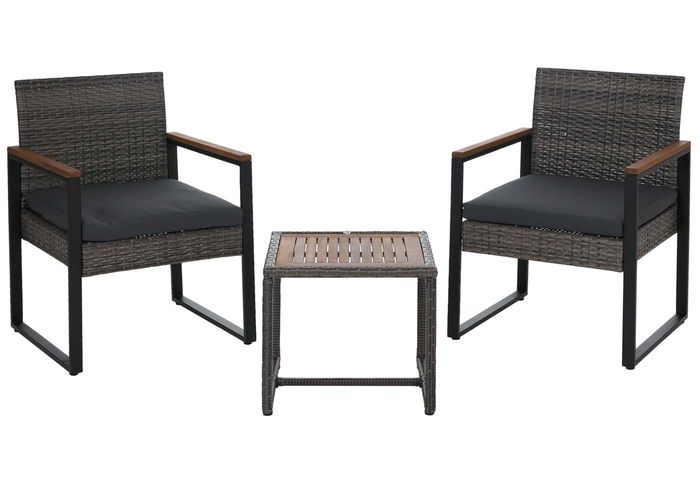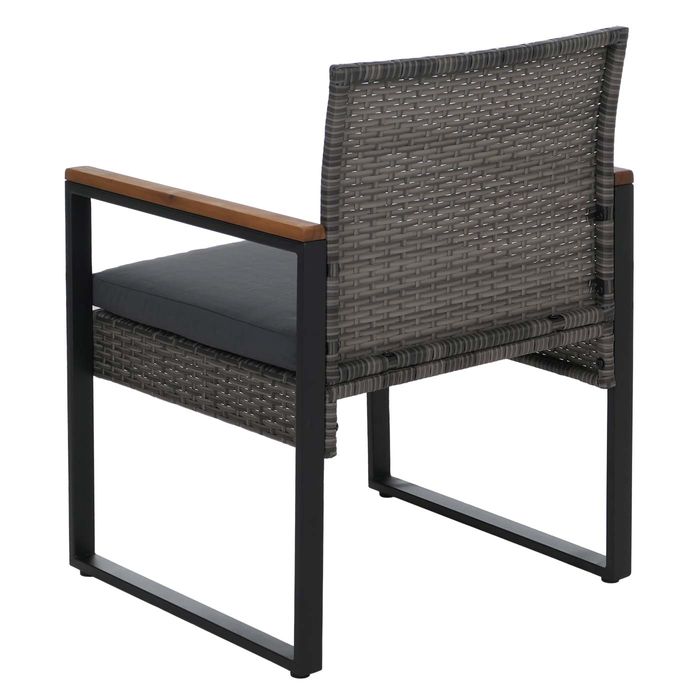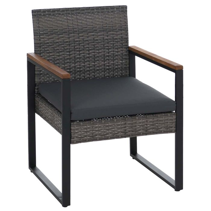 Dieses hochwertige Balkonmöbel Set bestehend aus 2 Stühlen und 1 Tisch vereint modernes Design mit langlebiger Qualität und ist die ideale Wahl für Garten, Terrasse oder Balkon. Die Kombination aus stabilem Gestell, edlem Polyrattan und natürlichen Akzenten aus Holz schafft eine stilvolle Lounge-Atmosphäre für entspannte Stunden im Freien. Das robuste Polyrattan überzeugt durch seine elegante Flechtoptik und hohe Widerstandsfähigkeit. Es neigt nicht zum Fasern, bleibt dauerhaft formstabil und ist optimal für den Einsatz im Aussenbereich geeignet. Die wasserabweisenden Bezüge schützen die Polster zuverlässig vor Feuchtigkeit und machen das Set besonders pflegeleicht und alltagstauglich. Ein besonderes Highlight sind die Armlehnen der Stühle sowie die Tischplatte aus massivem Akazienholz. Das hochwertige Hartholz begeistert mit seiner warmen, natürlichen Maserung und sorgt für einen stilvollen Kontrast zum dunklen Polyrattan. Gleichzeitig ist Akazienholz besonders robust und langlebig – ideal für den Outdoor-Bereich. Für hohen Sitzkomfort sorgen die bequemen Polster mit einer Stoffqualität von 180 g/m². Die Bezüge sind mit einem praktischen Reissverschluss ausgestattet, abnehmbar und waschbar, sodass eine einfache Reinigung jederzeit möglich ist. So bleibt Ihre Balkon Sitzgruppe dauerhaft gepflegt und einladend. Mit einer maximalen Dauerbelastbarkeit von ca. 160 kg pro Stuhl sowie ca. 75 kg für den Tisch bietet das Gartenmöbel Set zuverlässige Stabilität. Die integrierten, höhenverstellbaren Fussbodenschoner gleichen Unebenheiten aus und schützen empfindliche Untergründe. Ob als moderne Balkonmöbel, stilvolle Terrassenmöbel oder kompakte Garten Sitzgruppe – dieses 3-teilige Polyrattan Möbel Set mit Akazienholz vereint Komfort, Qualität und zeitloses Design für entspannte Momente im Freien.
