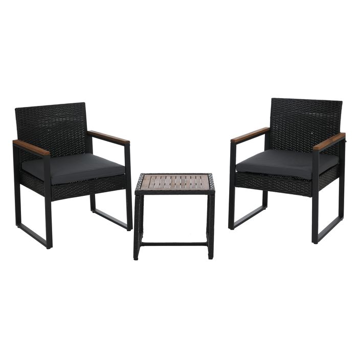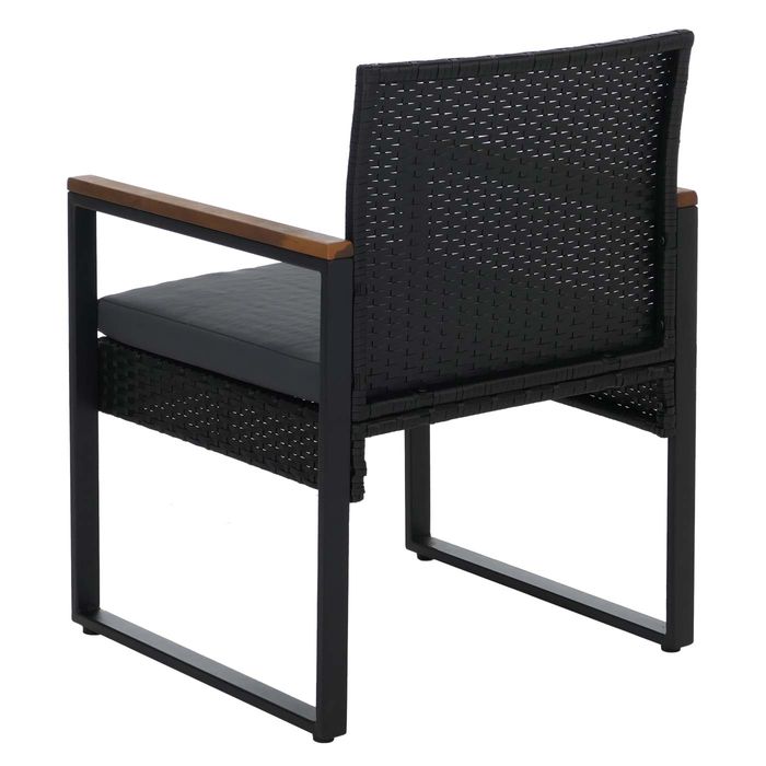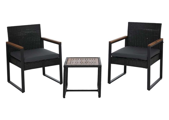 - Dieses Set mit zwei Stühlen und einem Tisch verbindet modernes Design mit hoher Funktionalität - ideal für Garten, Terrasse oder Balkon. Die Kombination aus Polyrattan und Holz schafft eine elegante Atmosphäre und lädt zu entspannten Stunden ein.