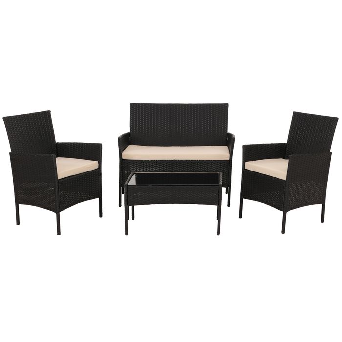 - Die Poly-Rattan Garten-Garnitur N98 bietet Platz für vier Personen und überzeugt durch eine robuste Verarbeitung mit wasserabweisenden, abnehmbaren und waschbaren Bezügen. Die Polster mit 900 g/m² Dichte sorgen für Komfort, während die Tischplatte aus gehärtetem Glas langlebig ist.