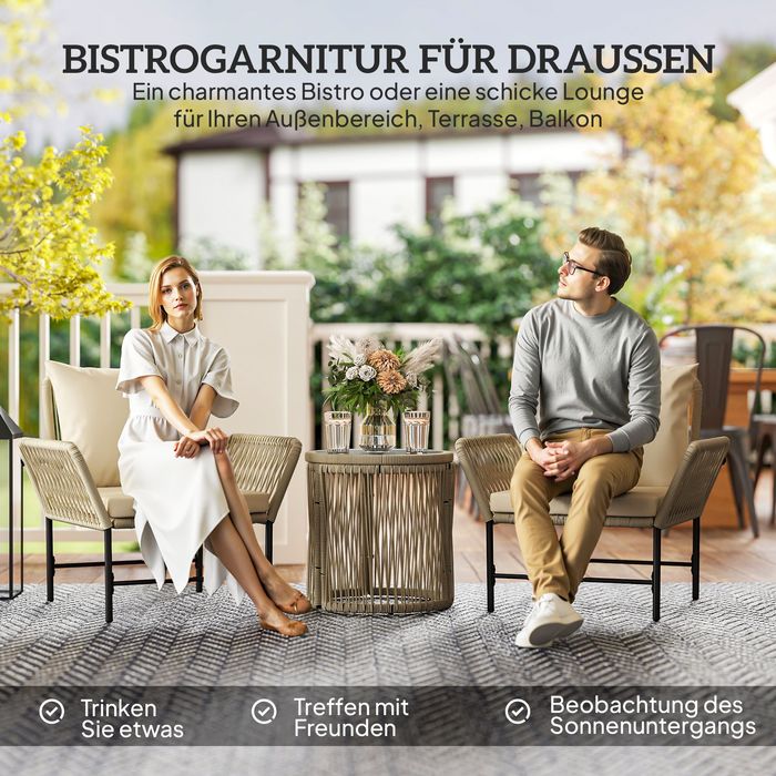 - Bequeme Sitzgelegenheiten: Erleben Sie höchsten Sitzkomfort mit weich gepolsterten Kissen an Sitz und Rückenlehne. Die abnehmbaren Bezüge des Bistro-Sets erleichtern zudem die Reinigung erheblich.