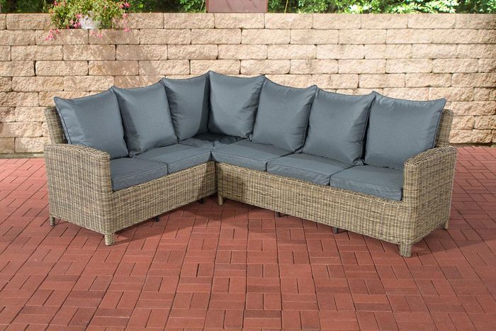 Das besonders gut für die Verwendung im Aussenbereich geeignete UV-beständige Material Polyrattan sieht aus wie herkömmliches Rattangeflecht, ist aber viel robuster. Die hochwertig verarbeiteten 5 mm dicken, runden Polyrattanfasern sind wasserfest, angenehm pflegeleicht und UV-beständig, sodass sie auch bei häufiger und langjähriger Nutzung unverändert ihre Farbtiefe behalten. Dieser edle Farbton sorgt in Kombination mit einer leichten Struktur für das absolut natürliche Erscheinungsbild dieser Möbelgarnitur.