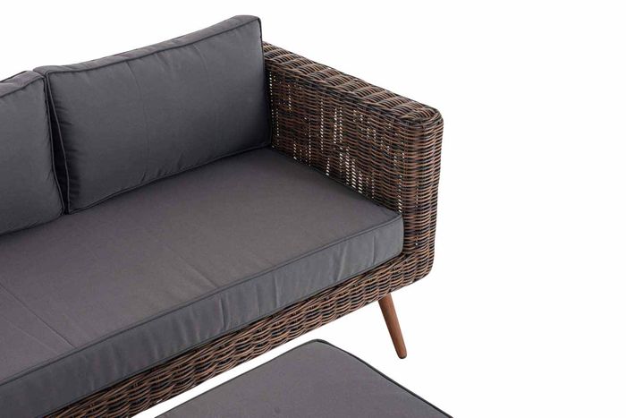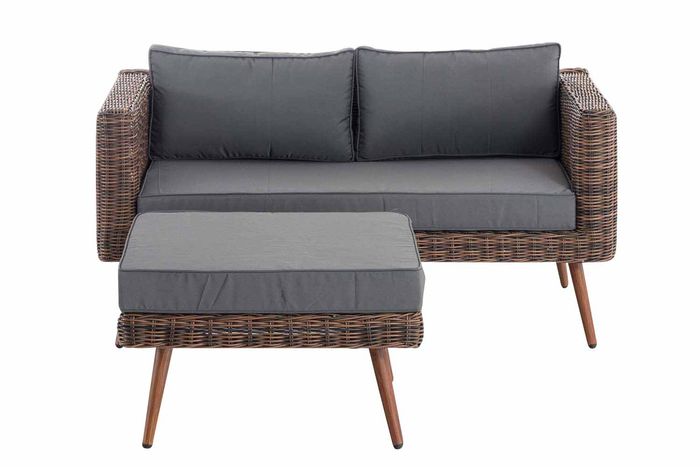 Diese schicke Gartenlounge entspricht ganz dem skandinavischen Stil. Das komfortable Lounge-Sofa mit passendem Fusshocker macht Ihren Garten, die Veranda oder bei schlechtem Wetter auch den Wintergarten zu einem gemütlichen Plätzchen. Das Sofa ist dank der grosszügigen Polsterkissen sehr komfortabel und optimal für lange Sommerabende mit Freunden. Das schöne Ensemble lässt sich leicht variieren und findet dank des stabilen und witterungsbeständigen Polyrattans und Aluminiumgestells überall seinen Platz - auch drinnen macht es sich gut. Die hochwertigen, lackierten Aluminiumfüsse in Holzoptik lassen sich leicht reinigen und bieten dank den Bodenschonerkappen sicheren Stand.