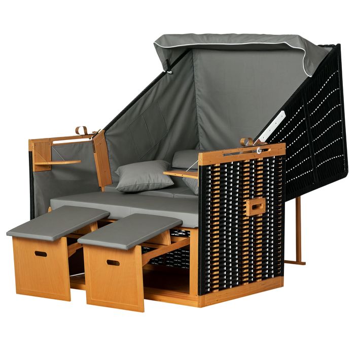 Schick und gemütlich zugleich: Der Der Gartenliege für 2 Personen ist ein echter Hingucker. Die Sonnenliege für 2 Personen macht sich ebenso gut auf der Terrasse wie im Garten und bietet Ihnen alles, was Sie von Strandkörben im Urlaub kennen: zwei praktische Klapptische, ausziehbare Fussstützen, ein Sonnendach zum Herunterklappen und die mehrstufig verstellbare Rückenlehne. Damit holen Sie sich echtes Strand- und Urlaubs-Feeling ganz bequem nach Hause!