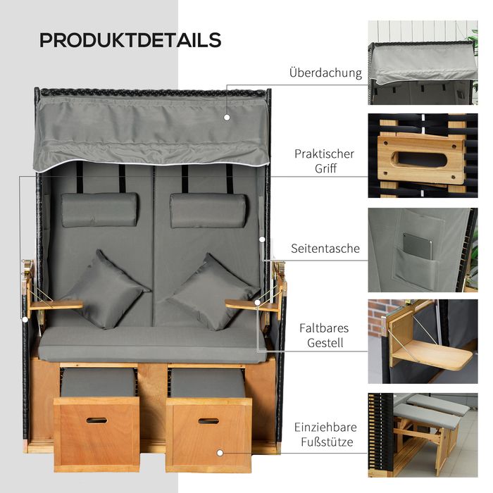 - Robust und langlebig: Der Rahmen des Strandkorbs besteht aus Metall und die Verkleidung besteht aus wetterfestem Kunststoffrattan.