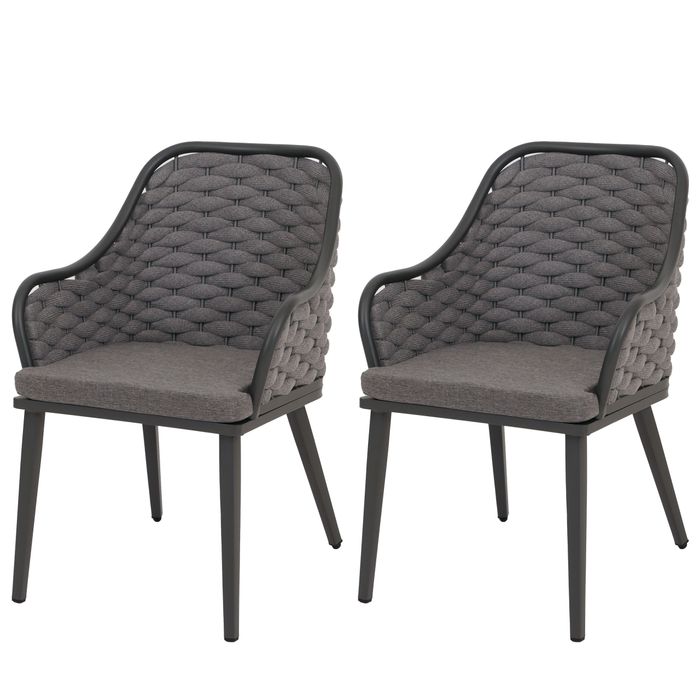 2er-Set Aluminium-Gartenstuhl HWC-O16, Outdoor Stuhl, Olefin (200 g/m²) Seilgeflecht Rope - anthrazit Kissen dunkelgrau