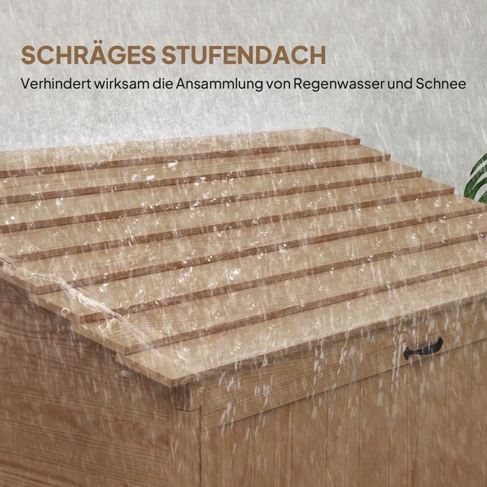 - ✔ Das abfallende Stufendach des Holzgeräteschranks sorgt dafür, dass Regenwasser und Schnee leicht abrutschen