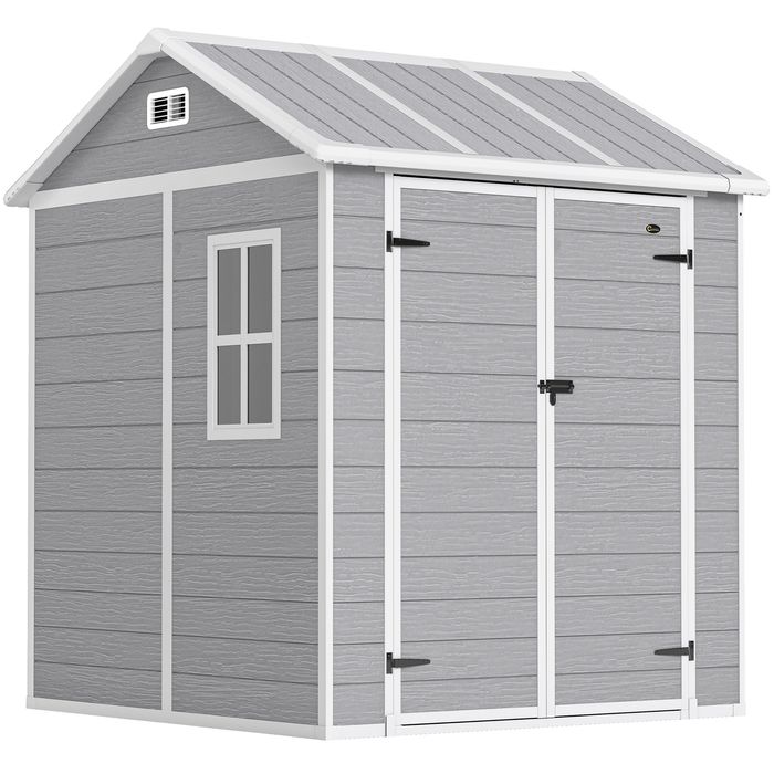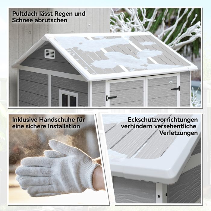 - Harzkonstruktion mit Boden: Aus 12 mm Holzimitat-Polypropylenharz gefertigt und mit Aluminium verstärkt, bietet diese Gartenhütte einen wasserdichten, UV-beständigen Schutz ohne Rost und Abblättern, komplett mit einem Boden gegen Regenwassereindringen.