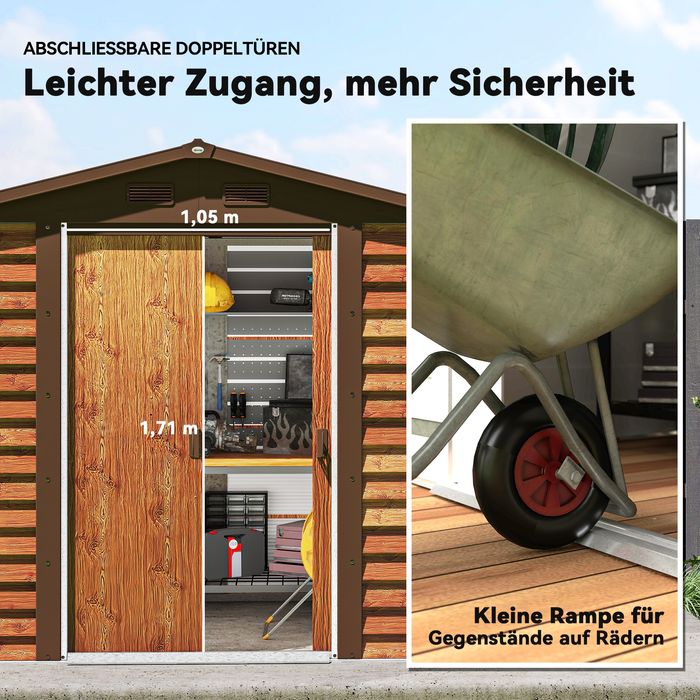 Bringen Sie Ihre Gartengeräte, Werkzeuge, Rasenmäher und mehr in diesem stilvollen und robusten Geräteschuppen unter. Gefertigt aus Stahl und mit einer Holzoptik versehen, vereint dieses Gartengerätehauses die zeitlose Schönheit von Holz und die Stärke von Metall. Mit doppelten abschliessbaren Schiebetüren und vier Fenstern bietet der Geräteschuppen eine sichere und geräumige Lagermöglichkeit für Ihre Werkzeuge und sorgt zudem für eine optimale Belüftung.