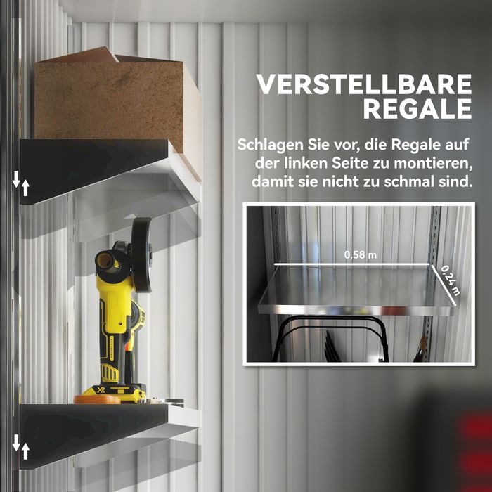 - Grösse 155x87 cm: Ein etwas kleinerer Schuppen mit zweistufigen, verstellbaren Regalen maximiert den Stauraum im Inneren und hilft Ihnen, Ihre Gartenutensilien übersichtlich und ordentlich aufzubewahren.