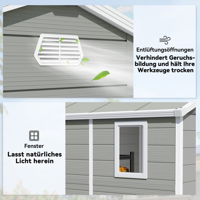 - Gute Belüftung: Optimale Luftzirkulation durch zwei obere Belüftungsöffnungen und ein Seitenfenster des Gerätehauses, die effektiv Schimmel und Feuchtigkeit im Inneren verhindern