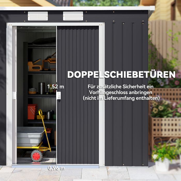 - Schiebetüren des Gartengerätehauses für einen leichten Zugang. Abschliessbar, Schloss nicht enthalten