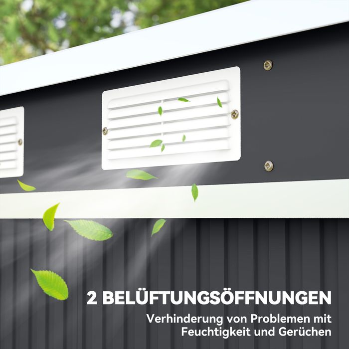 - Optimale Belüftung: Zwei Lüftungsöffnungen des Geräteschuppens sorgen für eine hervorragende Durchlüftung, verhindern Schimmelbildung und halten Ihre Ausrüstung stets in einwandfreiem Zustand