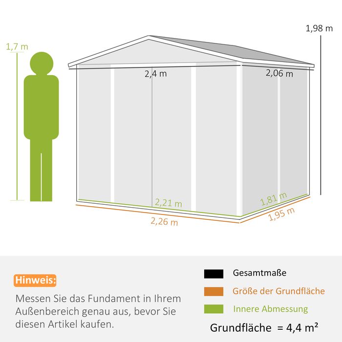 - Kompakt für kleine Gärten: Dieser 240Lx206Bx198H cm grosse Gartenschuppen bietet Platz für einen Rasenmäher, ein Fahrrad oder langstielige Rechen und Schaufeln. 4 Lüftungsfenster verhindern Probleme mit Feuchtigkeit und Gerüchen