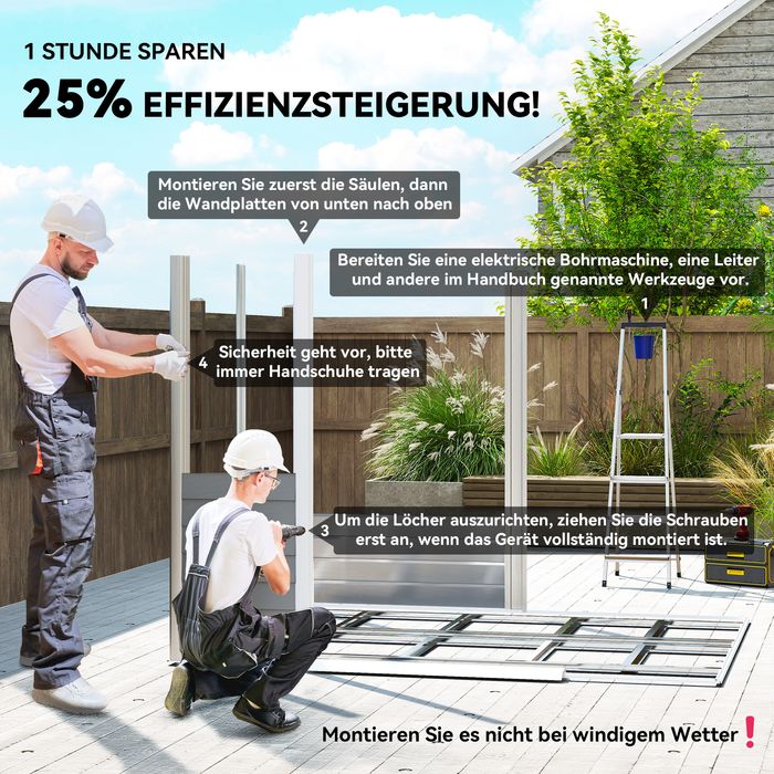 - Sparen Sie bis zu EINER Stunde Zeit: Im Gegensatz zu herkömmlichen Gartenhäusern mit komplizierten vertikalen Paneelen reduzieren unsere innovativen horizontalen Wandpaneele den Montageaufwand erheblich und steigern die Effizienz beim Aufbauen um 25 %