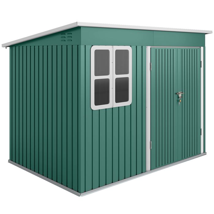 Gestalten Sie Ihren Garten neu mit dem Metall Gerätehaus, der 260 x 177 x 190 cm misst. Der Metall Geräteschuppen bietet ein transparentes Fenster und Lüftungsöffnungen, das Tageslicht durchlässt, sowie effektive Luftzirkulation. Die 114 cm breite Eingangstür mit sicherem Verschluss und Schloss macht den Gartenschuppen zur idealen Wahl für Ihre Zwecke und lagert Gartengeräte und weitere Gegenstände zuverlässig.