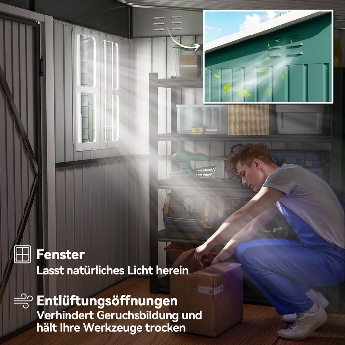 - Fenster des Geräteschuppens sorgen für Luftzirkulation, Lüftungsöffnungen reduzieren Feuchtigkeit und Gerüche