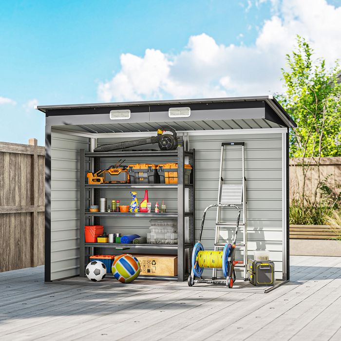 Schaffen Sie zusätzlichen Stauraum und Sicherheit in Ihrem Garten! Bewahren Sie Ihre Gartengeräte sicher und organisiert in unserem robusten Geräteschuppen auf. Die Lüftungsfenster des Gartengerätehauses verhindern Schimmel- und Geruchsbildung, während die verriegeltbaren Türen Ihre Werkzeuge vor unerwünschten Gästen. In diesem Gartenschuppen finden Gartengeräte, Poolzubehör und Werkzeuge den perfekten Lagerplatz. Schluss mit dem Gartenchaos und hallo, harmonisches, graues Paradies!