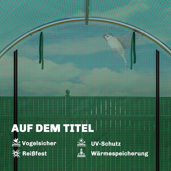 - PE-Abdeckung: Das 140 g/m² PE-Material ist wasserabweisend, UV-beständig und isolierend. 15 cm verlängerte Kanten des Folientunnels erhöhen Stabilität, Isolierung und Abdichtung durch Beschweren oder Eingraben in die Erde.
