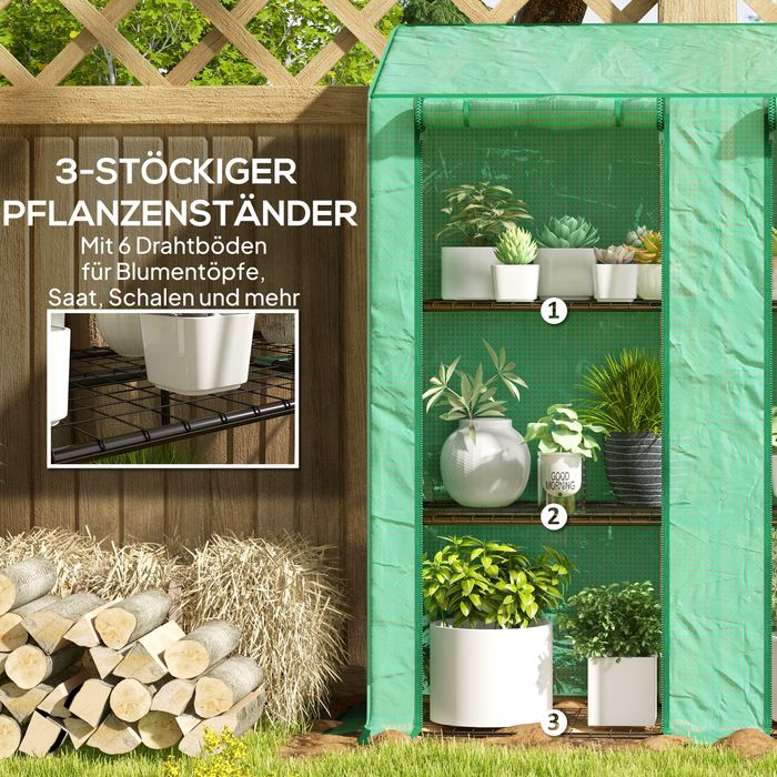 Vergessen Sie das Einfrieren Ihrer liebevoll gepflegten Pflanzen und Blumen! präsentiert ein kompaktes Tomaten Gewächshaus mit einem dreistöckigen Blumenregal, ideal für Gärtner jeder Erfahrungsstufe. Die PE-Abdeckung mit zwei aufrollbaren Türen des Indoor Gewächshauses fördert optimale Temperatur und Feuchtigkeit für das Pflanzenwachstum. Das Pultdach verhindert Wasserstau. Erleben Sie Gartenbaukunst mit dem kleine Gewächshaus.