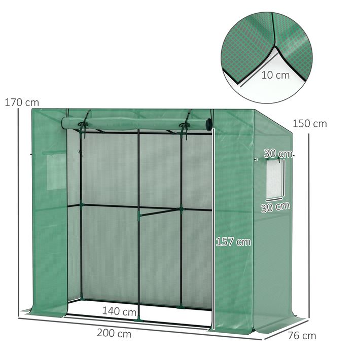 - Masse: 200Lx76Bx170/150H cm. Tür: 140Bx157H cm. Die Montage des kleinen Gewächshauses ist dank der Kunststoffverbindungen einfach und wird für zwei Personen empfohlen