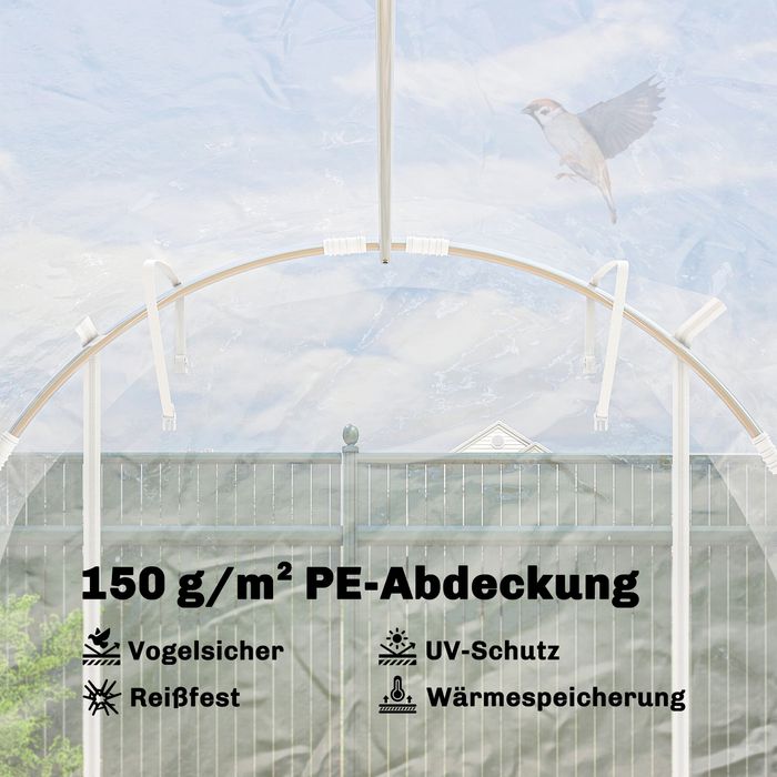 - PE-Abdeckung: Das 150 gsm PE-Material ist wasserfest, UV-beständig und wird mit 40 Clips fixiert. Die verlängerte Abdeckung des Folientunnels optimiert Isolierung und Abdichtung durch Beschweren oder Eingraben.
