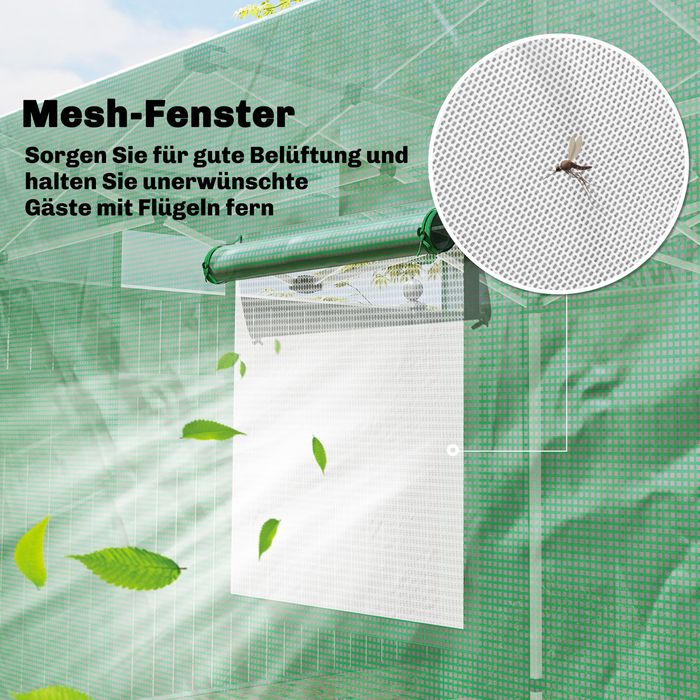 - Rolltüren & Fenster: Die mit Reissverschluss versehenen Rolltüren des Foliengewächshauses ermöglichen einen einfachen Zugang, während die aufrollbaren Fenster für eine optimale Belüftung sorgen und Ihren Pflanzen stets frische Luft bieten.