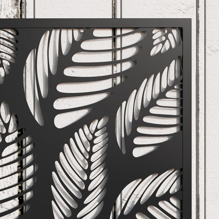 - Sichtschutzpaneel mit kleinen Blatt-Ausschnitten dient als Rankgitter