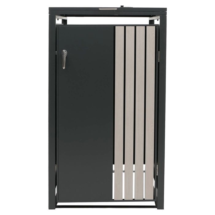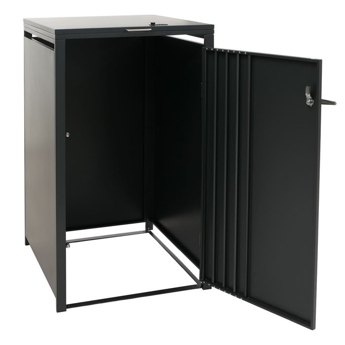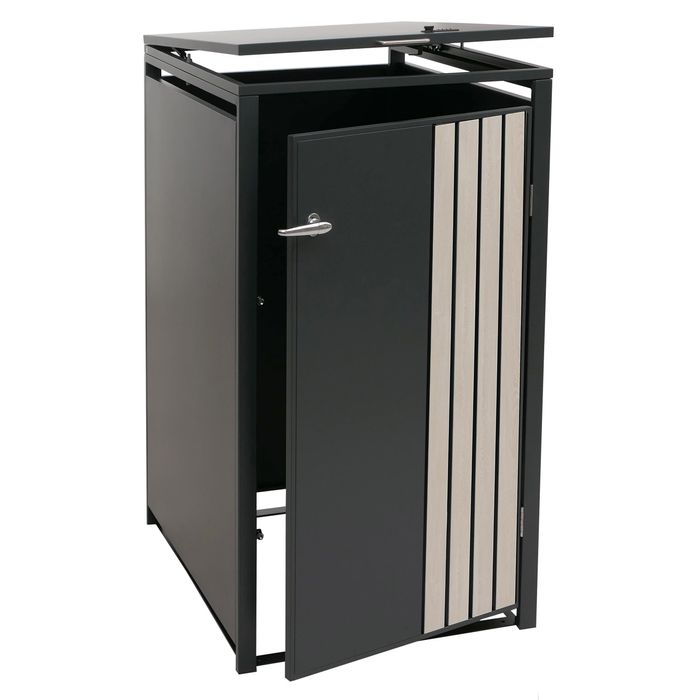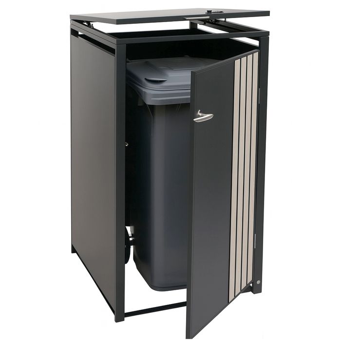 - Diese moderne Mülltonnenverkleidung ist nicht nur optisch ansprechend. Neben den abschliessbaren Türen und einem sehr stabilen Gehäuse ist der Deckel dieser Mülltonnenverkleidung mit einer Gasdruckfeder für angenehmes Handling ausgestattet.