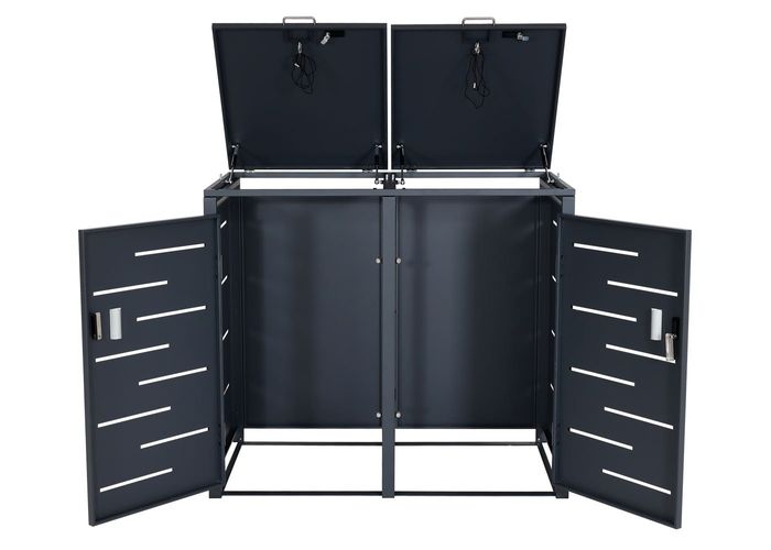 - Diese moderne Mülltonnenverkleidung, ausgestattet mit Belüftungsschlitzen, ist nicht nur optisch ansprechend. Neben der Schliessfunktion der Schlösser lässt sich diese Mülltonnenabdeckung ganz einfach mit weiteren Modellen unserer Serie erweitern.