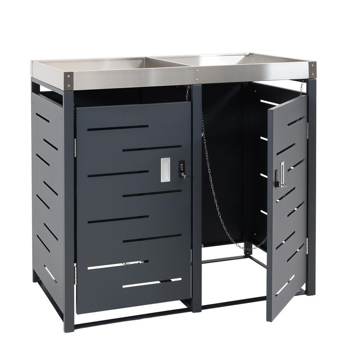 - Diese moderne Mülltonnenverkleidung mit Pflanzkasten ist nicht nur optisch ansprechend. Neben den abschliessbaren Türen lässt sich diese Mülltonnenabdeckung in anthrazit ganz einfach mit weiteren Modellen unserer Serie erweitern.