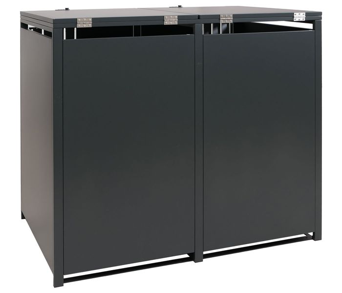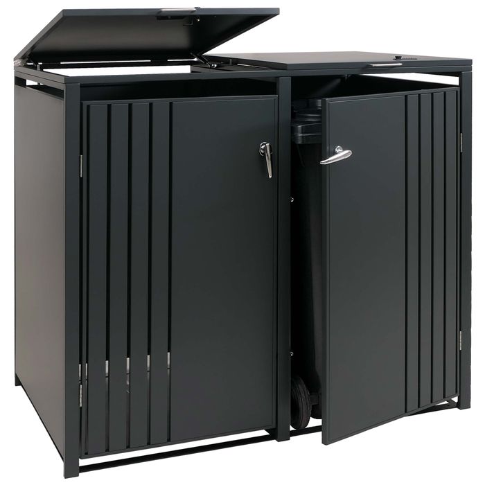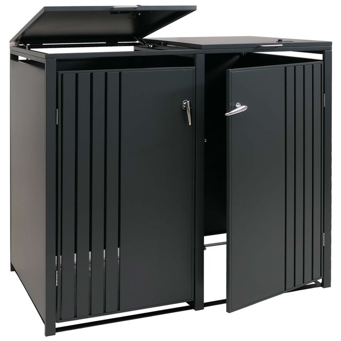 - Diese moderne Mülltonnenverkleidung ist nicht nur optisch ansprechend. Neben den abschliessbaren Türen und einem sehr stabilen Gehäuse, sind die Deckel dieser Mülltonnenverkleidung mit Gasdruckfedern ausgestattet.