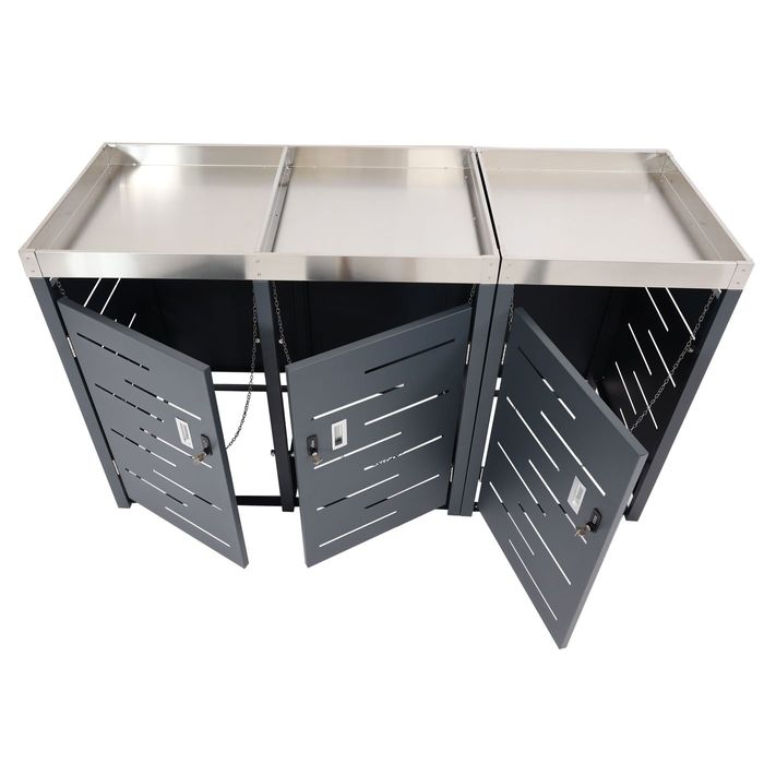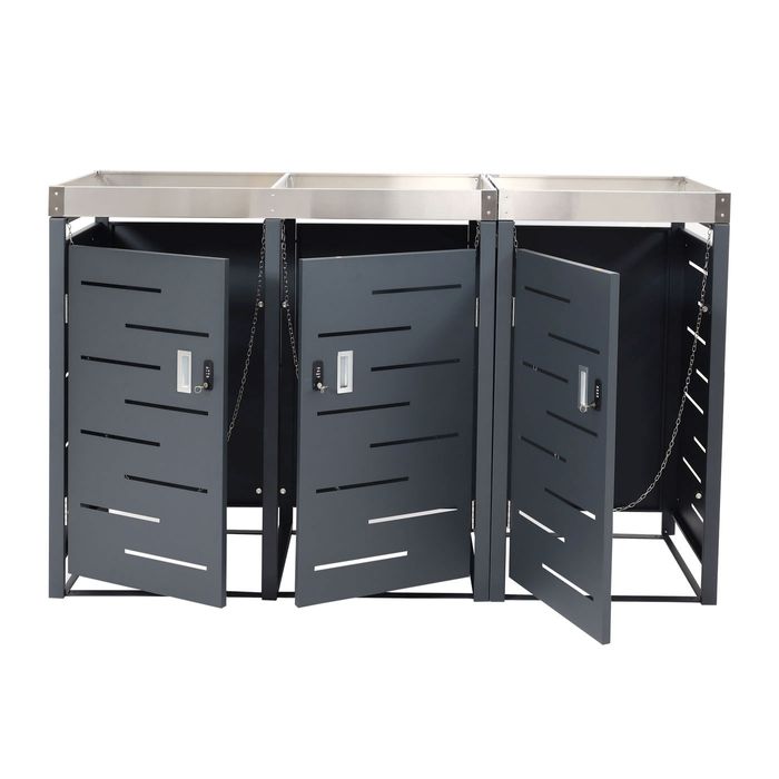 - Diese moderne Mülltonnenverkleidung mit Pflanzkasten ist nicht nur optisch ansprechend. Neben den abschliessbaren Türen lässt sich diese Mülltonnenabdeckung in anthrazit ganz einfach mit weiteren Modellen unserer Serie erweitern.