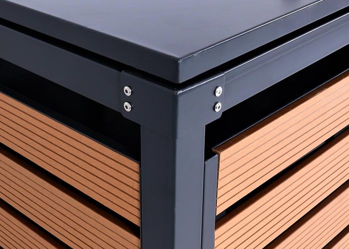 - Diese moderne Mülltonnenverkleidung ist nicht nur optisch ansprechend. Neben der abschliessbaren Tür und einem sehr stabilen Gehäuse, ist der Deckel dieser Mülltonnenverkleidung mit Gasdruckfedern ausgestattet.